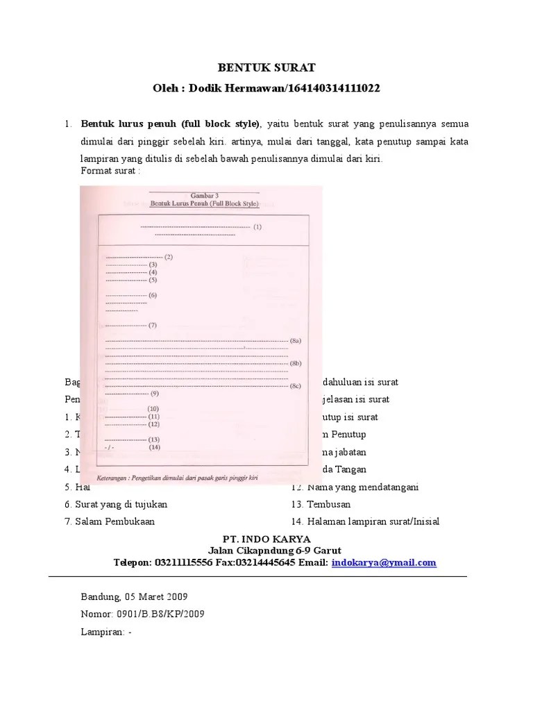 Format Bentuk Surat Full Block Style : Contoh Surat Permintaan Full Block Contoh Surat : Pada dasarnya mirip dengan surat full block style namun ada perbedaan pada penulisan penempatan tanggal, nama instansi, salam penutup,, nama jelas dan nama jabatan, dimana pada surat bentuk block style (lurus) diketik di sebelah kanan.. Berikut ini adalah contoh dari penulisan surat dengan format full block style. Format surat semi block style seperti pada format surat yang lain digunakan untuk surat resmi yang kedudukannya kurang formal jika dibandingkan dengan full block style. 07.04.2019 · surat full block style adalah surat berbentuk lurus penuh yang format penulisannya menggunakan rata kanan kiri. Sebab, cara penulisannya sangat khas dan terlihat. Berbeda dengan full block styel dan block style, setiap paragraf isi pada surat berformat semi blok style menjorok ke dalam.